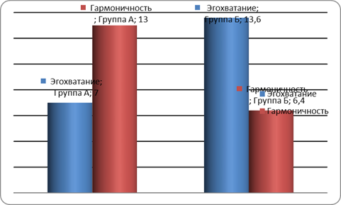 Рис. 2. Результаты теста Кноблоха-Фальконетта (внутренняя конфликтность личности) Математический анализ результатов по t-критерию Стьюдента показал по данной методике значимые статистические различия между группами (таблица 4.). Таблица 4 – Статистический анализ результатов теста Кноблоха-Фальконетта № Выборки Отклонения от среднего Квадраты отклонений В.1 В.2 В.1 В.2 В.1 В.2 1 11 3 -2.6 -4 6.76 16 2 15 2 1.4 -5 1.96 25 3 16 2 2.4 -5 5.76 25 4 17 10 3.4 3 11.56 9 5 18 10 4.4 3 19.36 9 6 18 7 4.4 0 19.36 0 7 10 10 -3.6 3 12.96 9 8 16 6 2.4 -1 5.76 1 9 11 6 -2.6 -1 6.76 1 10 12 7 -1.6 0 2.56 0 11 18 11 4.4 4 19.36 16 12 13 1 -0.6 -6 0.36 36 13 6 12 -7.6 5 57.76 25 14 14 10 0.4 3 0.16 9 15 13 13 -0.6 6 0.36 36 16 9 9 -4.6 2 21.16 4 17 19 9 5.4 2 29.16 4 18 8 5 -5.6 -2 31.36 4 19 10 4 -3.6 -3 12.96 9 20 18 3 4.4 -4 19.36 16 Суммы: 272 140 0 0 284.8 254 Среднее: 13.6 7 Результат: tЭмп = 5.5 Критические значения tКр p≤0.05 p≤0.01 2.02 2.71 Полученное эмпирическое значение t (5.5) находится в зоне значимости. Таким образом, анализ результатов показал, что в двух группах наблюдаются существенные отличия по уровню внутриличностного конфликта.Анализ корреляционной матрицы между шкалами методик показал, что значимая корреляция существует между шкалами «Эгохватание» и «Конфликтоустойчивость». Таблица 5. Корреляционный анализ методик