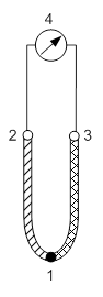 Рис.1.2 Контактные термометры: а - прямой контактный термометр; б - угловой контактный термометр Манометрический термометр основан на измерении давления, меняющегося в замкнутом пространстве с изменением температуры. Термометр сопротивления основан на измерении величины электрического сопротивления проводника или полупроводника, изменяющегося с температурой. Определение температуры с помощью таких датчиков заключается в измерении их сопротивления с использованием мостовой цепи Уитстона (рис.1.3), в которую включены четыре резистора, соединенные последовательно в замкнутый контур.