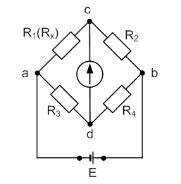 Рис.1.3 Схема измерения температуры с использованием мостовой цепи Уитстона К двум противоположным точкам моста а и в подключён источник питания Е, а к точкам с и d - измеритель равновесия схемы (гальванометр). Диагональ а-в получила название диагонали питания, а диагональ с-d - измерительной диагонали. Плечо RX является объектом измерения, плечо R3 - объектом сравнения. Резисторы R2 и R4 служат для создания разности потенциалов на измерительной диагонали. Гальванометр служит указателем измеряемой величины. Для измерения температуры применяют уравновешенные и неуравновешенные мосты. Схема измерения температуры металлическим термометром сопротивления на основе уравновешенного моста приведена на рис.1.4. Процесс измерения основан на создании условия равновесия, которое имеет вид: