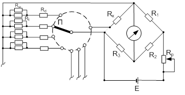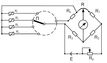 Рис.1.4 Схема измерения температуры металлическим термометром сопротивления: Rt - резисторы измерения; R1 и R2 - уравнительные резисторы; R3 - резистор сравнения; П - переключатель; Е - источник электрического тока