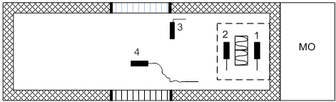 Рис.1.5 Схема размещения датчиков температуры в грузовом вагоне 5-вагонной секции БМЗ: 1 и 2 - датчики на входе и выходе воздуха их воздухоохладителя; 3 - датчик на боковой стене; 4 - датчик на гибком проводе. Кроме термометров сопротивления с датчиками из чистых металлов (платины, меди, железа) применяют термометры сопротивления с датчиками из полупроводников (термисторов), обладающих отрицательным температурным коэффициентом, т.е. с повышением температуры на один градус сопротивление их уменьшается на 1-3 %. Полупроводниковый термометр сопротивления представляет собой термистор, включенный в плечо неуравновешенного моста (рис.1.6).