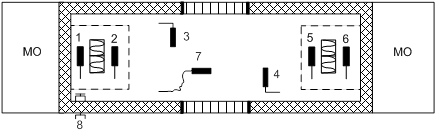 Рис.1.6. Схема измерения температуры полупроводниковым термометром сопротивления Перед каждым измерением температуры в рефрижераторном вагоне переключателем П включают контрольный резистор RК и устанавливают при помощи регулировочного резистора RР стрелку миллиамперметра в контрольное положение, обозначенное на шкале красной точкой, которая соответствует определенной температуре. После этого переключателем П поочередно включают термисторы. На шкале миллиамперметра стрелка указывает температуру в замеряемой точке. Температурный коэффициент термистора обратно пропорционален квадрату температуры, поэтому шкала измерительного прибора при непосредственном измерении сопротивления термистора Rt будет нелинейной. Линейную характеристику получают путем включения в цепь термистора Rt, шунтирующего RШ и дополнительного Rд резисторов. При этом характеристика цепи принимает вид прямой, а шкала измеряющего прибора будет равномерной. К достоинствам полупроводниковых термометров сопротивления следует отнести высокую точность измерения, легкость осуществления автоматической записи и дистанционной передачи показаний, простоту эксплуатации, дешевизну, продолжительный срок службы. Недостатком таких термометров является потребность в источнике электроэнергии. Полупроводниковые термометры сопротивления установлены в 5-вагонных секциях ZB-5 и автономных рефрижераторных вагонах (АРВ). Температурные датчики размещены на входе и выходе воздуха из испарителя (1 и 2 - первого испарителя, 5, 6 - второго) и на боковых стенах (3,4), а для измерения температуры груза служит датчик термометра на гибком проводе (7). Место подключения переносной термостанции обозначено цифрой 8. Схема размещения датчиков температуры в грузовом помещении АРВ приведена на рис.1.7.