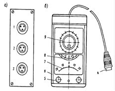Рис.1.8 Переносная термостанция Переносная термостанция (рис.1.8) - для измерения температуры в грузовом помещении АРВ и 5-вагонных секциях. При подключении к розетке 1 измеряют температуры входящего и выходящего воздуха воздухоохладителя первого агрегата, к розетке 2 - в грузовом помещении (левая и правая сторона), к розетке 3 - температура входящего и выходящего воздуха воздухоохладителя второй холодильной установки. Термостанция с помощью удлинителя 4 соединена со специальной вилкой 5, которую при измерении подключают поочередно в розетки 1,2,3. К термометрам сопротивления также относится термопара (рис.1.9), которая состоит из двух спаянных металлических проводников, присоединенных проводами к чувствительному гальванометру. По отклонению стрелки гальванометра определяют разность температур среды, в которую помещен рабочий спай, и среды, в которой находятся свободные концы термопары. С помощью термопары измеряют температуру в пределах от - 50°С до 1000°С и выше. Например, термопара платина-родий-платина имеет диапазон измерений от - 20 до 1300°С.