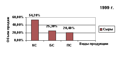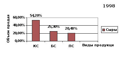 КС – колбасный сыр БС – брикетный сыр ПС – пастообразный сыр График 2. Процентное отношение производства отдельных видов продукции к общему объему за 1998, 1999, 2000 гг. Очевидно, что общий объем продаж выпускаемой продукции в денежном выражении в 1998 году составлял 83000 млн. рублей, в 1999 году – 85000млн. рублей, 2000 году – 97000 млн. рублей. То есть объем выпуска продукции увеличился. Увеличение объема выпуска сказалось и на структуре выпускаемой продукции. Наибольший удельный вес в 1998 году в общем объеме производства занимал колбасный сыр (54,2 %), в 1999, 2000 годах удельный вес уменьшился и на 2000 год составлял 48,9 %. В то же время увеличился удельный вес брикетных сыров в общем объеме продукции. Если в 1998 году он составлял 25,3 %, то в 2000 году – 32,9 %. Далее можно проанализировать и дать оценку выполнению плана по производству и реализации продукции за отчетный период, 2000 год. Таблица 4 Анализ выполнения плана по выпуску и реализации продукции предприятием ОАО «Сыры Калужские» за 2000 год