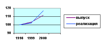 Из таблицы видно, что за три года объем производства вырос на 11,7 %, а объем реализации продукции увеличился на 16,8%. То, что за 2000 год темп производства продукции ниже темпа реализации, говорит о том, что нереализованная продукция на складах предприятия и неоплаченная покупателями в 1999 году реализована в 2000 году полностью. Среднегодовой темп роста (прироста) выпуска и реализации продукции можно рассчитать по среднегеометрической: