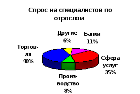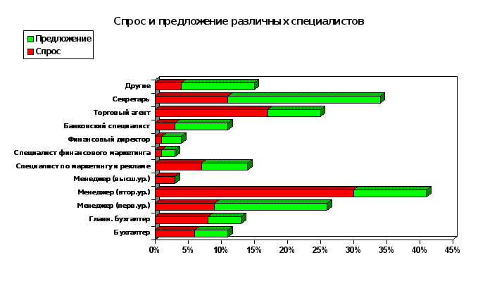 Структура спроса. Как отмечают работники рекрутерских фирм, если весной наблюдался большой спрос на банковских работников, то к сентябрю потребность в них заметно сократилась. Эксперты связывают данное обстоятельство с банковским кризисом: мелкие банки прекратили свое существование, крупные - пока стараются воздерживаться от приема на работу новых сотрудников. По данным исследований московского рынка общий спрос на работников банков в рейтинге наиболее популярных специальностей упал с 7% в июле до 4% в сентябре. Тем не менее представители "Агенства "Контакт"" заметили, проблема поиска поиска банковских специалистов в настоящее время решена на уровне бухгалтеров и среднего менеджмента (начальников отделов). Так, предложение на должность бухгалтеров банков сегодня соответствует 23%, а спрос - 0%. В то же время на потребность в высококласных банковских специалистов не повлиял даже банковский кризис. Например, в большом дефиците люди, способные работать начальниками управлений и отделений банков.