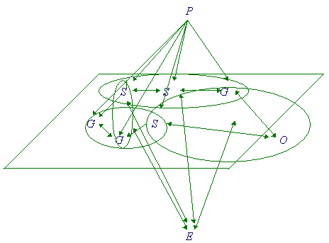 Figure 1. Hirama networking pattern. This is a "momentary close-up" picture, since this structure is dynamic, and creative subunits included in it are constantly in the process of formation & disintegration (fission-fusion structures, resembling the hunter-gatherer society pattern, see Maryansky and Turner, 1992). Designations: S, subproblem leaders; G - just group members; O - an outsider collaborating with the group on one of the subproblems. Thin-line circles are temporary creative subunits or discussion groups. These relationships all correspond to the "task-fullfillment plane" shown in the picture. The psychology and "external affairs" leader (P and E, respectively), are beyond this plane. Types of relations: → partial (task-limited) leadership; ↔ horizontal networking; no symbol between two individuals, standing by and watching.