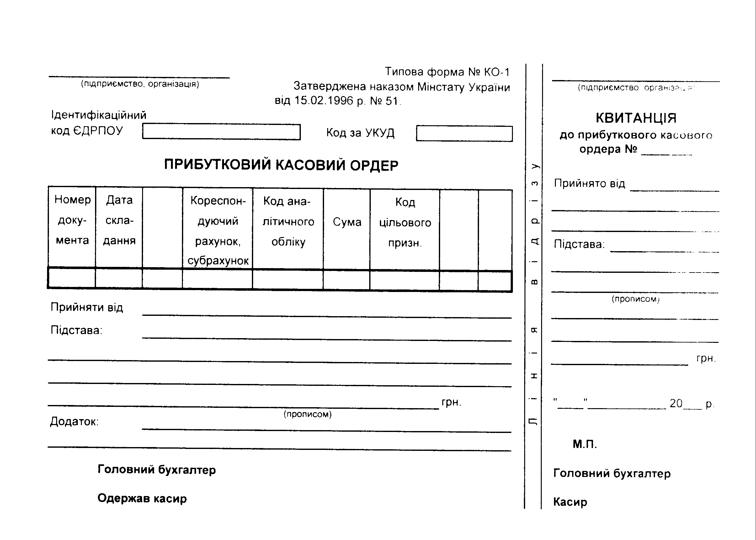Видати ________________________________________________________________ (прізвище, ім’я, по батькові) Підстава: ______________________________________________________________ _______________________________________________________________________ __________________________________________________________грн. ______коп. (прописом) Додаток: _______________________________________________________________ _______________________________________________________________________ Керівник Головний бухгалтер Одержав: _________________________________________________ грн. ______коп. «___» ______________20__р. Підпис За ____________________________________________________________________ (найменування, номер, дата та місце видачі документа, який засвідчує особу одержувача) ______________________________________________________________________ Видав касир ______________________