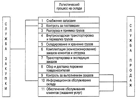 Рисунок 4. Транспортировка объединенных партий: Распределительная система 4. Предоставление услуг. Очевидным аспектом этой функции является оказание клиентам различных услуг, обеспечивающих фирме высокий уровень обслуживания потребителей. Среди них: подготовка товаров для продажи (фасовка продукции, заполнение контейнеров, распаковка и т. д.); проверка функционирования приборов и оборудования, монтаж; придание продукции товарного вида, предварительная обработка (например, древесины); транспортно-экспедиционные услуги и т.д. 2. Логистический процесс на складеЛогистический процесс на складе весьма сложен, поскольку требует полной согласованности функций снабжения запасами, переработки груза и физического распределения заказов. Практически логистика на складе охватывает все основные функциональные области, рассматриваемые на микроуровне.