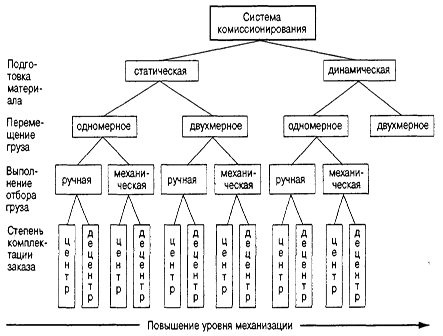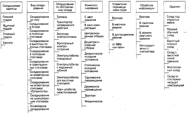 Рисунок 6. Схема систем складирования Каждая подсистема включает в себя целый ряд возможных элементов (рис. 6). При этом число элементов, составляющих основные подсистемы, может быть достаточно значительным, а сочетание их в различные комбинации еще более увеличивает многовариантность системы. Это означает, что альтернативный выбор всех конкурентоспособных вариантов должен осуществляться в определенной последовательности с учетом технико-экономической оценки каждого из них. Выбор рациональной системы складирования должен осуществляться в следующем порядке: 1) определяется место склада в логистической цепи и его функции; 2) определяется общая направленность технической оснащенности складской системы (механизированная, автоматизированная, автоматическая); 3) определяется задача, которой подчинена разработка системы складирования; 4) выбираются элементы каждой складской подсистемы; 5) создаются комбинации выбранных элементов всех подсистем; 6) осуществляется предварительный выбор конкурентоспособных вариантов из всех технически возможных; 7) проводится технико-экономическая оценка каждого конкурентоспособного варианта; 8) осуществляется альтернативный выбор рационального варианта. Выбор элементов складских подсистем ведется с помощью схем и диаграмм или с помощью разработанных программ на ЭВМ. Это обеспечивает методический подход с учетом всех возможных вариантов. 3.1. Определение места склада в логистической системе и общая направленность его технической оснащенностиМесто склада в логистической системе и его функции напрямую влияют на техническую оснащенность склада. Склад встречается в различных функциональных областях логистики (снабженческой, производственной и распределительной). Склады в области снабжения, с учетом их хозяйственной принадлежности (поставщика, посредника, производителя) условно можно разделить на две группы: 1) склады сырья и материалов (груз, как правило, в жидком или сыпучем состоянии) работают с однородным грузом, с большими партиями поставки, относительно постоянной оборачиваемостью, что дает возможность ставить вопрос об автоматизированной складской переработке груза; 2) склады продукции производственного назначения (тарных и штучных грузов). Как правило, это грузы с высокой массой, относительно однородной номенклатуры, требующие в основном высокого уровня механизации и автоматизации складских работ. Склады производственной логистики связаны с обработкой груза относительно постоянной номенклатуры, поступающего и уходящего со склада с определенной периодичностью и малым сроком хранения, что позволяет добиться автоматизированной обработки груза или высокого уровня механизации проводимых работ. Склады распределительной логистики, основное назначение которых — преобразование производственного ассортимента в торговый и бесперебойное обеспечение различных потребителей, включая розничную сеть, составляют наиболее многочисленную и внутри себя разнообразную группу. Они могут принадлежать как производителям, так и оптовой торговле. Склады готовой продукции и распределительные склады производителей в различных регионах сбыта (филиальные склады) занимаются обработкой тарных и штучных грузов однородной номенклатуры с быстрой оборачиваемостью, реализуемых крупными