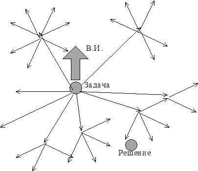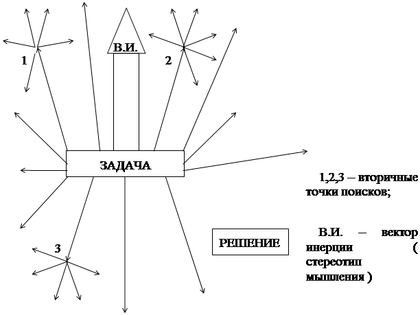 Один из первых методов – мозговой штурм ( Brainstorming ) – это попытка американца А. Осборна ( 1939 г.) усовершенствовать метод “проб и ошибок”. За прототип этого метода можно принять “ техническое совещание “. Логика этого метода следующая: однородная группа участников совещания делится на две группы . В первую группу включены люди , склонные к выдвижению идей – “ генераторы“ , разных специальностей , и не связанные иерархическими служебными отношениями. Во вторую группу – специалисты с критическим складом ума – “критики” , способные отобрать и развить рациональные , конструктивные предложения. Поиск идей в решении поставленной задачи проводится под руководством ведущего – “ лидера “ – наиболее эрудированного в проблеме специалиста , пресекающего беспредметную критику : “ Это слишком сложно “ , “ Так уже делается “ , “ Это невозможно реализовать технически “ и т.п.; и поощряющего развитие выдвигаемых идей. Всё это создаёт условия для разрешения содержащихся в задаче противоречий на интуитивном уровне. Таким образом главная задача штурмующей группы – “единым мозгом “ преодолевать преграды на пути решения поставленной задачи. Этот метод не устранил беспорядочность поисков , органически присущую методу “ проб и ошибок “, а сделал поиски “ещё более беспорядочными”. Проиллюстрируем это схемой : В ещё большей беспорядочности и заключается прогресс : на схеме видно , что преодолевается направление “ В.И.“ и увеличивается “ степень ветвистости “ направлений поисков . То есть прогресс достигается за счёт сокращения малоперспективных попыток в направлении “ В.И.“. Но этот прогресс обеспечивается количественным путём – задачу решают “ оравой “, что, с учётом подготовки к “ штурму “, требует несколько сотен человеко-дней . И если задача решена в течении одного рабочего дня – это эквивалентно затратам изобретателя-одиночки в течение 100 дней. Поэтому технические задачи этим методом решаются редко. Лучшие результаты получают при решении задач (менеджмента) организационных (реклама, управление, планирование).А также, т.н. , “обратных изобретательских задач” на новое применение оригинальной технической идеи , нового вещества или эффекта.
