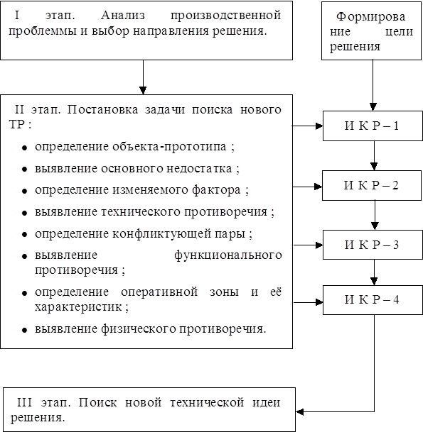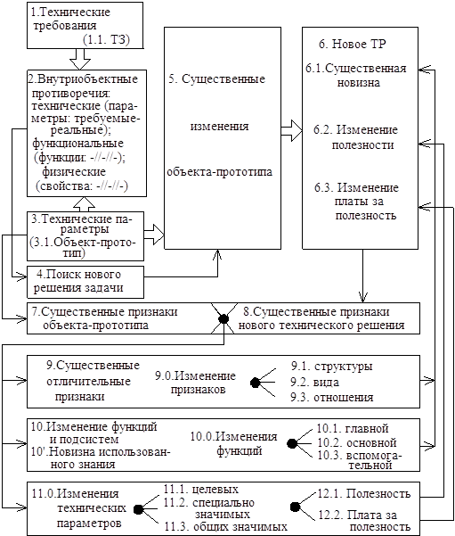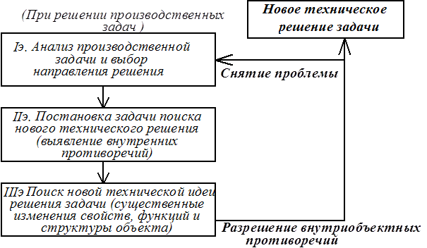 (Иерархическая структура) Поиск новой технической идеи (ТР) решения задачи состоит в последовательном выявлении внутренних противоречий и их решении. Если вспомните критерии изобретения: ²новизна² и ²существенные отличия², то можно сказать, что они являются составляющими более общей характеристики – существенной новизны изобретения, которое появляется при разрешении технических противоречий. Эта характеристика количественно описывается,– –числом существенных отличительных признаков и качественно,– –уровнем изменений объекта– прототипа, новизной использованного знания и изменением параметров объекта. В результате изменения параметров объекта изменяются две обобщённые противоречивые характеристики: полезность объекта и плата за эту полезность. Если техническая задача решена–создано изобретение, то изменения параметров должны соответствовать требуемым внутренним и внешним положительным эффектам. Т.о., поиск готовой технической идеи решения задачи - является наиболее ответственным этапом создания изобретений. Этот процесс можно разделить на три основные этапа: (смотреть структурную схему)