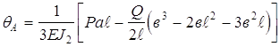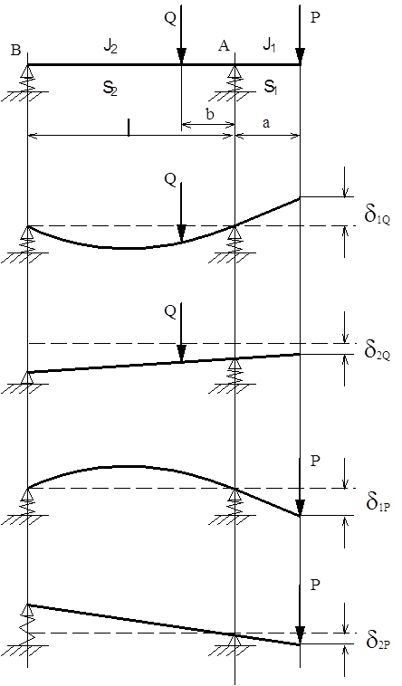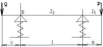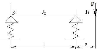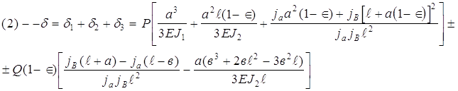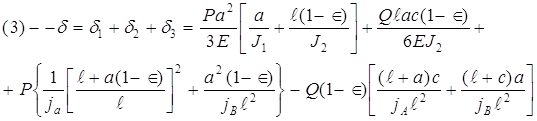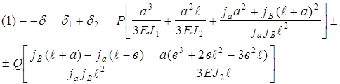 Эта схема типична для токарных, фрезерных станков и для многоцелевых станков с ЧПУ. Радиальное упругое перемещение шпинделя в расчетной точке слагается из следующих перемещений: d1Q– тела шпинделя от силы Q в ПЭ ; d2Q – деформация опор от силы Q ; d1Р – тела шпинделя от силы резания P ; d2Р – деформация опор от силы Р. l – межопорное расстояние; а –вылет шпинделя (консоль); в –расстояние от передней опоры до сечения ПЭ; J1–среднее значение осевого момента инерции консоли; J2 –среднее значение осевого момента инерции в МОР; S1 и S2 – площади поперечных сечений; Е–модуль Юнга материала шпинделя; G=E/[2(1+m)] – модуль сдвига; ja и jb– радиальная жесткость передней и задней опор; Є– коэффициент защемления в передней опоре. Упругое перемещение переднего конца шпинделя, слагающееся из всех названных выше перемещений, но без учёта защемляющего момента: