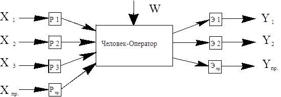 W – воздействие внешней среды . Y = F ( X , W ) .Основные рецепторы ( органы чувств ) : Р 1 – зрение ; Р 2 – слух ; Р 3 – осязание ; Рпр. – (тактильные) : обоняние ,вкус ,равновесие (вестибулярный аппарат ) . Основные эффекторы (формируют сигналы управления ) : Э 1 – пальцы рук (кисть) (точные , но менее сильные ) ; Э 2 – ноги ( менее точные , но более сильные ) ; Эпр. – звуковые команды ( речь ) , биоэлектрические потенциалы, параметры физиологической активности ( t°, потоотделение , частота пульса и др. ) В соответствии с органами чувств на деятельность человека оказывают влияние (W) : освещённость и цвет среды ; шум , атмосферное давление ; характер поверхностей , с которой имеется контакт ; наличие запахов и токсичных веществ ; рабочая поза , t°C и влажность ( термолабильность ) . Для оптимизации связи Человека–Оператора с Оборудованием необходимо знать : какое количество информации Человек– Оператор может принять , передать или переработать в единицу времени : «Пропускная» способность и предельные скорости различных реакций ; какова точность восприятия и выдачи различных сигналов : время «задержки» (обработки) сигналов ; какова надёжность работы Человека–Оператора : способность противостоять W . При этом вопросы необходимо решать путём «подгонки» параметров объекта конструирования под способности и возможности человека , а не наоборот . Т.к. приём и переработка информации – процессы познавательные (ощущение – восприятие – представление ® мышление ) , которые сформировались в течение тысячелетий эволюции человека . «Прибором» человека , с помощью которого он воспринимает или формирует сигналы , являются анализаторы : Рецептор + Нервные пути – центр в коре больших полушарий . Рецепторный аппарат тесно связан с эффекторным (двигательным ) аппаратом . Если рассмотреть Схему прохождения сигнала по контуру управления : Человек–Оператор « Объект , можно выделить 9 характерных стадий ( звеньев ) :