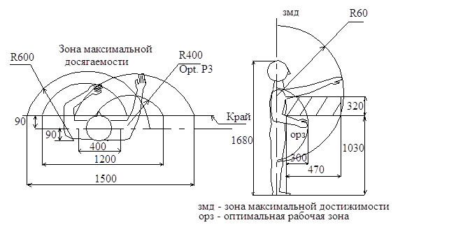 1. 30....40° 2. 50....60° 3. 90° ® рабочие зоны Человека–оператора при управлении ручными и ножными регуляторами ; ¯ анализируют характер движений .