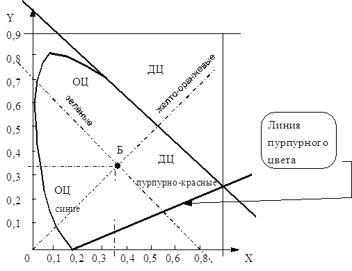 Все спектральные цвета расположены на плоскости ХУ по дуге, имеющей показанный вид. По прямой стягивающей эту дугу, расположены пурпурные цвета, не являющиеся спектральными.