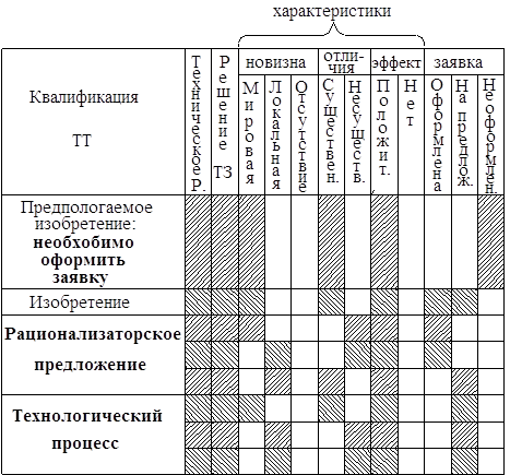 Остановимся подробнее на вопросах изобретательской деятельности. Прежде всего – вопрос выявления изобретений. В виду того, что источником изобретений являются научные институты и ПК разработки, авторы разработок ведают как созданием, так и выявление изобретений. Успех создания ТР, способных быть предметом изобретений, непосредственно зависит – от стремления конструктора каждую задачу решать творчески, по–новому, с получением максимального положительного эффекта. Каждый конструктор должен знать основные источники и методы выявления изобретений. Выявление изобретений опирается на следующее: ¬ – знание известного состояния и уровня техники в области новой разработки (профессиональное требование); – знание критериев патентоспособности; ® – умение провести сопоставительный анализ новой разработки с уже известными (на мировом уровне) и оформить заявку на предполагаемое изобретение. Должностная инструкция инженера–конструктора: Должен знать: …, Порядок и методы проведения патентных исследований; основы изобретательства; …, основы технической эстетики и художественного конструирования, …, передовой отечественный и зарубежный опыт разработки аналогичных объектов … Главные критерии изобретения (патентоспособность) Вернёмся к нормативному определению изобретения – сокращенно: "Изобретение – это новое и обладающее существенными отличиями ТЕХНИЧЕСКОЕ РЕШЕНИЕ задачи …, дающее положительный эффект" Т.о. основные критерии: ¬ – техническое решение задачи; – существенные отличия; ® – новизна (мировая или абсолютная); ¯ – положительный эффект. Любое заявляемое изобретение должно содержать в себе ТР – не идею, не постановку задачи, а её ТР. При этом для некоторых видов изобретений, в частности, когда объектом И являются способы, термин "ТР" применяется в широком смысле: как практическое средство удовлетворения определённых потребностей. Задача считается решённой при следующих условиях: –решение содержит указания на технические средства (способы) для её решения; –решение раскрывает основную схему; –решение осуществимо: возможность его многократного воспроизведения с помощью общеизвестных приёмов и средств техники. ¬ Соответствие критерию новизна проверяется по отношению к существующему мировому уровню техники, поэтому она и называется мировой или абсолютной: автор изобретения – единственный (и первый), кто сделал что–то именно так! После разработки нового технического решения необходимо выявить предмет изобретения. Для этого в патентоведении используют понятие "существенные признаки", к которым могут относится конструктивные элементы и связи, характеристики элементов и режимы операций. Признаки объектов изобретений: устройства, способы, вещества – подразделяют на три группы: признаки структуры, вида и отношения (Табл. 1). Предмет изобретения выявляется путём сопоставления существенных признаков нового ТР и объекта–прототипа. Объект–прототип – наиболее близкий из аналогов к предложенному новому ТР. Аналоги – сходные однородные изобретения. Таблица 1