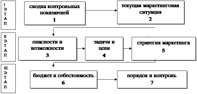 Рис. Ступени и этапы плана маркетинга Подготовительный этап Сбор информации Эта ступень программы посвящена сбору всей доступной и необходимой для дальнейшего построения стратегии информации и ее анализу. Всю информацию банки получают из различных источников, которые можно подразделить на внешние источники и внутренние источники. А сама информация может быть первичной и вторичной. К первичной информации прибегают в случае недостаточности вторичной. Первичные данные - это данные маркетинговых исследований, то есть информация собранная специально для построения стратегии. Для полевых маркетинговых исследований применяют следующие методы: 1. Социальные опросы, которые могут быть как скрытыми так и открытыми, а также проводимые лично по телефону или по почте; 2. Интервью групповые или индивидуальные; 3. Наблюдения; 4. Эксперимент; 5. Имитация, то есть моделирование с помощью ЭВМ или методом деловых игр.[1] К первичной информации будут относится и результаты маркетинговых исследований, проведенных сторонними организациями по заказу банка. Вторичная информация - это все доступные данные,которые могут быть использованы в целях маркетинга. Внешние источники такой информации: - сведения о других банках в СМИ, - статистический материал, - публикации Центрального банка (ЦБ), - данные Ассоциации Российских Банков (АРБ), - мнения экспертов и научных деятелей о банковском рынке, - информация, полученная с конференций, совещаний, презентаций и пресс-конференций, - результаты проверок различных служб ( аудиторов, ЦБ, налоговой службой). Внутренние источники: - бухгалтерские и финансовые отчеты, - данные исследований проводимых ранее, - обзор отзывов клиентов, - сообщения работников банка. Вся эта информация разграничена по трем направлениям: а) информация о макросреде , б) информация о микросреде , в) информация о своем предприятии (банке ). Макросреда складывается из следующих элементов: 1)технологическая среда, 2) экономическая среда, 3) социокультурная среда, 4) политико-правовая среда, 5) природная среда. Технологические факторы - это технические и технологические нововведения в банковской сфере, позволяющие сделать банковскую деятельность более эффективной ( ускорить платежи, автоматизировать некоторые операции и т. п. ). Экономические факторы , такие как рост или спад производства, устойчивое денежное обращение или инфляция и рост неплатежей, снижение или повышение уровня жизни, оказывают непосредственное влияние на состояние банковского рынка и, следовательно, на состояние отдельных банков. Влияние социокультурных факторов выражено в изменении демографической ситуации, а отсюда изменения ассортиментной политики банка, в изменении общественно-культурного сознания или сохранении прежнего менталитета, что требует от банка осторожной разъяснительной рекламной политики, и т. д. Политико-правовые факторы достаточно сильно изменяют положение в экономике и банковской сфере, что необходимо учитывать при формировании стратегии, а для этого требуется хорошо ориентироваться в законодательстве и текущей политической ситуации. Природные факторы оказывают меньшее влияние на банковскую отрасль, чем на отрасли производства, но современная модель социально-этического маркетинга предполагает необходимым их учет не только для поднятия прест
