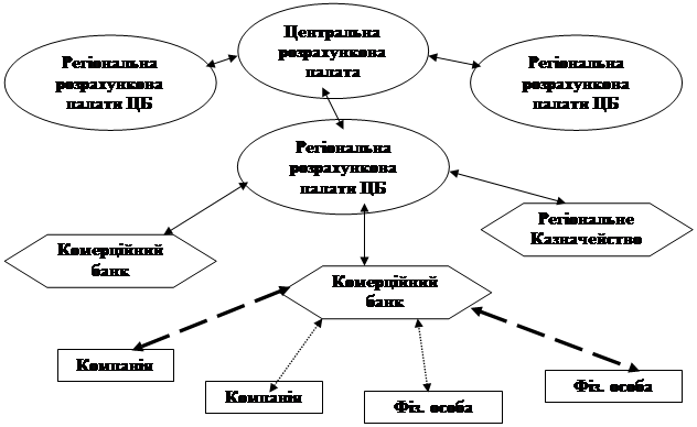 Рис. 1.1.1. Типова схема побудови платіжної системи країни Особливе місце в платіжних системах посідають банки. Вони не тільки беруть участь у них як звичайні платники та одержувачі коштів, а й як посередники в платежах, покликані якнайшвидше, в режимі реального часу доставити грошові кошти від платника до одержувача. Цю свою роль у платіжній системі банки виконують через сукупність розрахункових операцій, які, по суті, є ключовим елементом платіжної системи, і забезпечують функціонування всього грошового обороту. В організації розрахункових операцій можна виділити три етапи: · підготовка організаційних, технічних та технологічних передумов для здійснення платежу; · підготування та передача інформації щодо платежу; · переказування чи передавання грошей – сам платіж. На першому етапі здійснюються такі дії, як відкриття в банках рахунків для учасників платіжної системи, створення систем зв’язку, приймання, оброблення, обліку та передавання інформації, емісія платіжних карток тощо. Система “клієнт-банк” приймає участь у розрахункових операціях банку вже на цьому етапі шляхом створення систем зв’язку, механізмів оброблення та передавання інформації. На другому етапі виконується підготовка, забезпечення захисту, та перевірка на справжність інформації, що передається банку, необхідної для здійснення платежу на певних носіях, за допомогою певних інструментів. Електронні документи є складовою частиною інформації, що передається банку для виконання певних операцій. Система “клієнт-банк” допомагає формувати платіжні документи, виходячи з визначених правил побудови, шифрує інформацію задля захисту від злочинних дій третіх осіб та за допомогою вбудованої поштової програми переправляє документи до банку. На третьому етапі здійснюється переказування грошей з рахунку платника на рахунок одержувача, приймання-видання готівки з рахунків клієнтів чи залік взаємної заборгованості. Розрахункові операції банки здійснюють з урахуванням загальних принципів, на яких базується організація платіжних систем: · економічні агенти (юридичні чи фізичні особи) – власники грошових коштів мають право вибору форми платежу (безготівково чи готівкою) в межах діючого законодавства та право вибору банку, в якому вони зберігають кошти і через який здійснюватимуть розрахунки, обираючи також і засоби доставки платежу до банку (паперовий носій чи електронний); · зберігання коштів у банку та їх переказування здійснюється на банківські рахунки, які відкриваються клієнтам на їх прохання при згоді банка. Кожна особа має право відкрити декілька рахунків у різних банках. Доступ до кожного з клієнтських рахунків може бути здійснений за допомогою системи “клієнт-банк”; · переказ коштів чи видача готівки здійснюється банком за розпорядженням власника в порядку визначеної їм черговості та в межах залишку коштів на рахунку, з застосуванням рукописного підпису розпорядження чи електронного цифрового підпису; · форма переказування банком коштів по рахунку клієнта визначається самим клієнтом відповідно до форми безготівкових розрахунків, передбаченої в його господарському договорі з контрагентом, при невтручанні банку в договірні відносини між ними. Банк може лише пропонувати шляхи якомога кращого та оперативного виконання розрахунків; · ст
