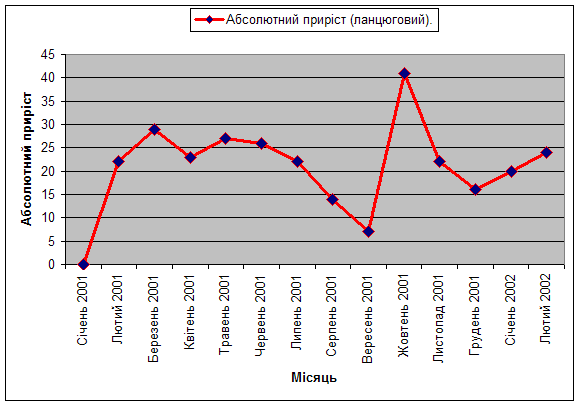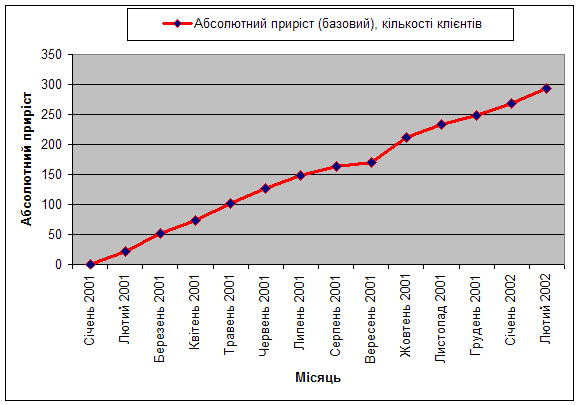 Рис. 2.2.2 Динаміка абсолютного приросту кількості клієнтів КФ АКІБ “УкрСиббанк” (метод базових підстановок). назустріч своїм клієнтам, намагається полегшити їхнє фінансове життя, шляхом надання якісних послуг висококваліфікованими виконавцями. Значно цікавішим буде розглянути ланцюговий абсолютний приріст показника кількості клієнтів, адже він дозволить описати зміни всередині періоду (Див. Рис. 2.2.3 на стор. ). Як видно з графіку приріст протягом періоду був далеко не тенденційним і легко можна відзначити значні перепади графіку, що відображають різкі коливання у фактичних темпах розвитку показника. Так, якщо у першому кварталі 2001 року зростання було поступовим із виходом на пік в останньому місяці кварталу – березні, то вже на початку другого кварталу починається певний спад, який вдається локалізувати і вийти на піковий показник у травні 2001р. (другому місяці кварталу), після чого знову