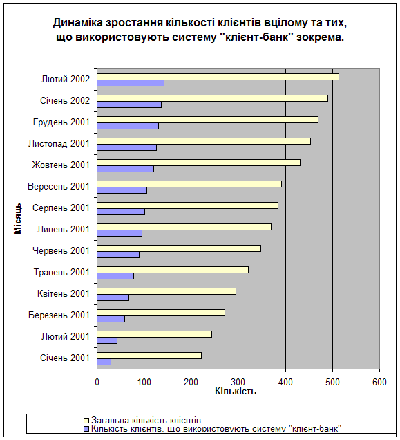 Як і по загальній кількості клієнтів ми маємо постійне зростання показника кількості клієнтів, що використовують в своїй діяльності систему “клієнт-банк”, причому темпи цього зростання на перший погляд вражаючі. Стрімкий розвиток комп’ютерних технологій та їх застосування у бухгалтерському обліку та банківській діяльності зробили послугу системи “клієнт-банк” доступною широкому загалу клієнтів, що можуть тепер обмінюватись інформацією та платіжними документами з банком, не встаючи зі свого робочого місця. Це дозволяє швидко реагувати на потреби компанії, з точки зору фінансових ресурсів, проведення платежів та заощаджень робочого часу. Ці фактори знайшли відображення в таблиці. Для наглядного відображення данної інформації, варто відобразити її у графічному вигляді у порівнянні із загальною кількістю клієнтів.