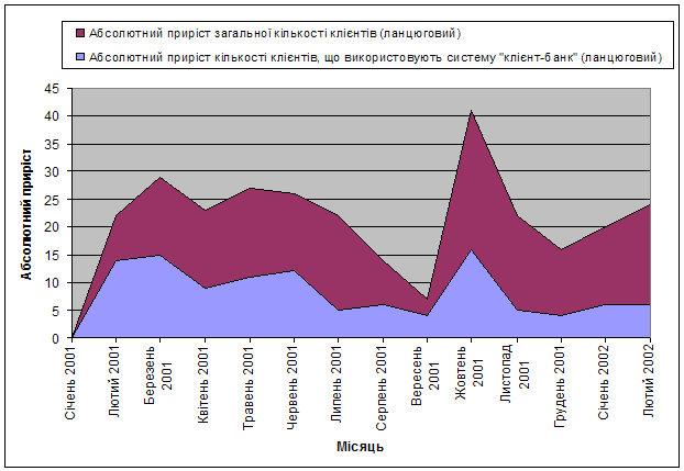 Абсолютний приріст, за розглядуваний період, клієнтів, що використовують систему “клієнт-банк” склав 113 клієнтів. На початку періоду кількість становила 29 клієнтів. Тобто приріст був майже в чотири рази більший, аніж початковий показник – це відображає надвисокий темп зростання клієнтів, що прагнуть застосовувати у своїй співпраці з банком високотехнологічні продукти – яким безумовно є й система “клієнт-банк”. Цікавим буде відображення на одному графіку ланцюгових показників абсолютного відхилення кількості клієнтів, що використовують систему “клієнт-банк” та загальної кількості клієнтів. Це дасть нам змогу порівняти динаміки всередині розглядуваного періоду.