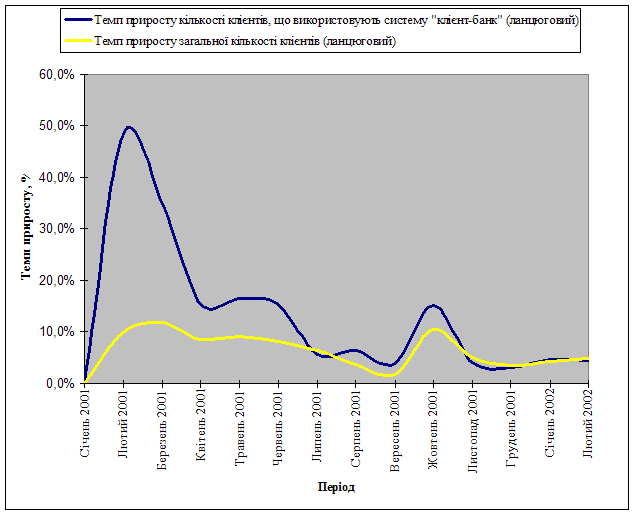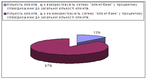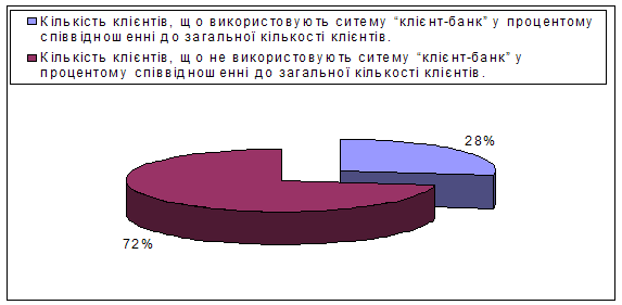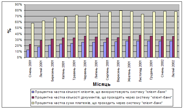 З даних таблиці ми бачимо, що процент клієнтів системи “клієнт-банк” на протязі досліджуваного періоду знаходився у межах від 13% до 28%, причому на протязі всього періоду прослідковувалась тенденція до росту процентного відношення клієнтів, що почали застосовувати у своїй практиці систему, якщо у перші три місяці щомісячний приріст складав 5п.п., 3п.п. та 2п.п. відповідно, то в останні три – структура була абсолютно незмінною на рівні 28%, що свідчить про стабилізацію ситуації та врівноваження ситуативного перекосу, що існував на початку 2001 року.