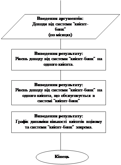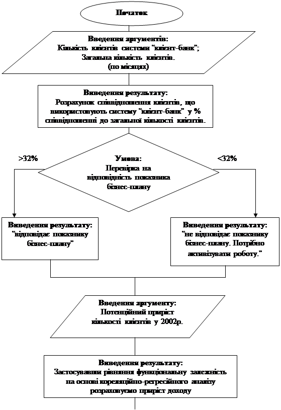 Продовження Рис. 4.2.1. Блок-сема роботи макросу “Аналіз ефективності роботи системи “клієнт-банк”. Як видно з блок-схеми, робота програми побудована на принципі повторення операції введення аргументу з подальшим обчисленням і виведенням на екран результатів обчислення. Побудова графічного матеріалу працює аналогічно за допомогою команди “inputbox”, що дозволяє ввести аргументи, з подальшим використанням введеної інформації як параметрів побудови графіку. Також застосовується функція “IF”, що дозволяє задати умову виконання операції, та в залежності від результату перевірки умови видає той чи інший результат. Інструкція з використання програми: 1. Розпочати роботу з програмою “Аналіз ефективності роботи системи “клієнт-банк” можна вибравши команду “Макрос” із пункту меню “Сервіс” та вибравши відповідний макрос – “Аналіз ефективності роботи системи “клієнт-банк” або ж нажавши сполучення “гарячих клавіш” – Ctrl+А. Після цього потрібно запустити роботу макросу натиснувши кнопку “Виконати”. 2. Система виведе на екран повідомлення про своє призначення – аналіз ефективності роботи системи “клієнт-банк”. 3. Система формує загальну оболонку таблиці, заголовки колонок та перелік місяців аналізу. Після чого виводить запит про кількість клієнтів, що використовували систему “клієнт-банк” на кінець кожного з досліджуваних місяців. Наприклад: “Введіть кількість клієнтів, що використовували систему “клієнт-банк” на кінець Січня місяця?”. Потрібно ввести фактичні значення за запитуваний місяць. 4. Система робить запит про загальну кількість клієнтів банку, аналогічно попередньому запиту. Необхідно ввести фактичні значення по кожному місяцю. 5. Система розраховує долю клієнтів, що використовують систему “клієнт-банк” в загальному обсязі клієнтів, у процентному співвідношенні. Після чого пропонує користувачу простежити чи виконується відповідний показник бізнес-плану в 32%. Після натиснення кнопки “ОК”, система проводить співставлення фактичних результатів із показниками бізнес-плану з виведенням на екран результату або “показник бізнес-плану виконано”, або “показник бізнес-плану не виконується. Потрібно активізувати роботу”. 6. Наступним кроком програми є визначення потенційного приросту доходів від системи “клієнт-банк” у наступному періоді часу (в нашому випадку це 2002 рік). Система пропонує ввести потенційний приріст клієнтів у 2002 році. Після введення значення система на основі кореляційно-регресійного аналізу, з допомогою якого було встановлено функціональну залежність між показниками, розраховує приріст доходу в середньому у 2002 році. 7. Підтвердивши перегляд результатів і натиснувши кнопку “OK”, користувач переходить до аналізу доходності системи “клієнт-банк”. Для цього програма робить запит користувачу на введення доходів отриманих від системи “клієнт-банк”, підсумком з початку року на кінець місяця. 8. На основі отриманих даних система розраховує показники: “Рівня доходності на одного клієнта” та “Рівня доходності на одного клієнта системи “клієнт-банк”. 9. Наступним кроком програми є пропозиція користувачу розглянути графік приросту кількості клієнтів вцілому та кількості клієнтів, що використовують систему “клієнт-банк”. У разі підтвердження пропозиції натисненням кнопки “OK”, сис