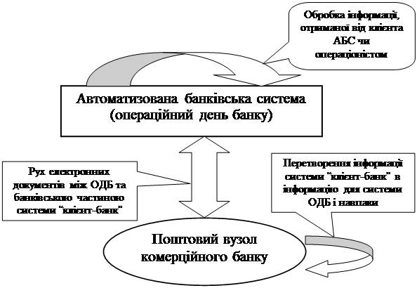 Рис.1.2.1. Принцип роботи типової системи “клієнт-банк”. • обмін платіжними документами з програмним комплексом ОДБ (зокрема, банківська частина системи «клієнт - банк» може бути одним з компонентів ОДБ), який власне і виконує розрахунки клієнта за документами, що отримані через систему «клієнт - банк», а також ведення рахунків клієнтів з відображенням фактично виконаних трансакцій; • обмін із клієнтською частиною допоміжною технологічною інформацією та бухгалтерськими документами на зразок «виписка з рахунку», на основі яких клієнт має змогу отримати повну інформацію про стан свого рахунку та рух коштів на ньому; • ведення протоколів роботи, архівів проведених (та відхилених) трансакцій. «Клієнтська частина» — комплекс, що розміщений на підприємстві клієнта. Його функції: • ведення необхідної нормативно-довідкової інформації; • ведення значення рахунку клієнта, що є відображенням рахунку, який ведеться в банку, з максимально можливою точністю. Можливе ведення двох варіантів значень рахунку: з урахуванням тільки фактично проведених документів - фактичного, та з урахуванням «коштів у розрахунках» — прогнозованого; • підготовка початкових платіжних документів (або автономно, або прийом їх із програми автоматизації бухгалтерії підприємства); • обмін з банком платіжними документами; • отримання відповідних платіжних документів з банку; • обмін з банком технологічною інформацією та надання клієнту повної інформації про стан виконання розрахунків за кожним з платіжних документів, що проходить як через систему «клієнт-банк», так і за межами системи (наприклад, проведення документів цього клієнта в паперовій формі через операціоніста банку); • ведення протоколів роботи, архівів проведених (та відхилених) трансакцій. Можлива наявність окремої підсистеми телекомунікації, яка дозволяє побудувати банківську та клієнтську частини незалежно від конкретних засобів електронної пошти і внаслідок цього забезпечити функціонування програмного забезпечення системи «клієнт-банк» у різних телекомунікаційних середовищах. В Україні вже існують системи «клієнт-банк», які є невід'ємною складовою програмного комплексу автоматизації бухгалтерії клієнта. Це дозволяє не тільки повністю автоматизувати бухгалтерський облік на підприємстві, а й побудувати єдину технологічну лінію для виконання всіх фінансових операцій підприємства. Архітектура кожної конкретної системи «клієнт-банк» та специфіка технології її роботи перебувають в досить широкому діапазоні. Практично широка розробка та впровадження систем «клієнт-банк» в Україні тільки починається. Тому найближчими роками очікується різке зростання як кількості клієнтів, що користуватимуться цим сучасним видом послуг, так і рівня програмно-технічних розробок таких систем. 1.3. Огляд світової та національної законодавчих баз, що регламентують електронний документообіг Правове регулювання електронного документообігу: Хоч електронний документообіг в сучасному світі став глобальним і розгалуженим, далеко не всі відносини між його учасниками регулюються спеціальними законами або іншими юридичними документами. Розвиток електронного документообігу, пов'язаний не лише з технологією, а й із правом, потребує професійних підходів, чіткої взаємодії традиційно далеких одна ві