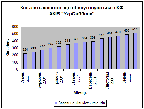 Неозброєнним оком помітно значне зростання кількості клієнтів, починаючи з початку 2001року – це ознаменовано приходом до керівництва філією нової команди, що зуміла завоювати довіру клієнтів: як промислових та технологічних гігантів (так званих “блакитних фішок”), так і середній та малий бізнес, аж до суб’єктів підприємницької діяльності – фізичних осіб. Саме малий та середній бізнес забезпечує банку основний приріст показника кількості клієнтів.