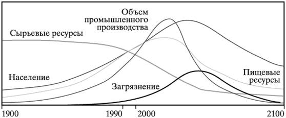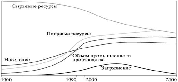 Рис. 1. Динамическая модель Дж. Форрестера На рисунке 1 видно, что модель представляет собой простую экстраполяцию существующих тенденций роста населения и истощения известных запасов природных ресурсов. По этой модели в 20-е гг. XXI в. ожидается системный кризис, который привёдет к гибели значительной части населения от голода. На рисунке 2 представлена модель же, которая учитывала глобальное планирование и «разумное руководство».