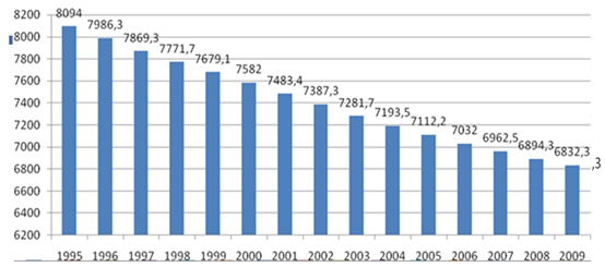 Рис. 1. Динамика численности населения Донецкого региона, тыс. чел. (на 1 января) [рассчитано и составлено по данным 4, с. 258; 5, с. 327] Коэффициент естественного прироста Донецкой области составляет 9,8 – 18,1 = 8,3% [4, с. 259]. Так, естественная убыль населения в 2008 г. составила 37544 чел., что на 30% меньше, чем в 2000 г. В 2008 г. число умерших превысило число родившихся в 1,8 раз. Увеличился и миграционный отток из области, он составляет теперь 0,9 тыс. чел. в год. За последние 8 лет Донецкая область потеряла 452,9 тыс. чел. – это население одного города! В 2000 г. численность населении области составляла 4953,4 тыс. чел., а на начало 2009 г. 4500,5 тыс. чел. В табл. 1 приведены основные показатели естественного прироста населения Донецкого региона в 2008 г. Таблица 1. Основные показатели естественного прироста населения Донецкого региона в 2008 г. [4,с. 258; 5, с. 327]