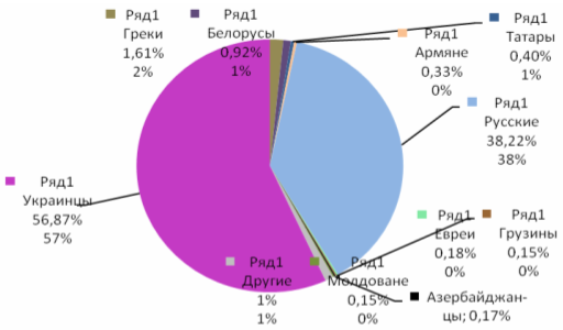 2. Структура населения (половозрастная, национальная) Донбасс отличается пестрым национальным составом населения. Здесь проживают украинцы, русские, греки, белорусы, болгары, евреи, молдаване и др. – всего более 120 национальностей других народов. В национальном составе населения региона украинцы ненамного преобладают над русскими, что является характерной особенностью данного региона. Только в трех городах Донецкой области крупнейшей этнической группой являются русские (Донецк - 48,2 % русских и 46,7 % украинцев, Енакиево - 51,4 % русских и 45,3 % украинцев, Макеевка - 50,8 % русских и 45,0 % украинцев)[11, с. 157]. На рис. 2 приведен национальный состав населения Донецкого региона.