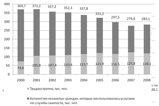 Рис. 4 Трудоустройство незанятых трудовой деятельностью граждан Донецкого региона [рассчитано и составлено по данным [4, с.267; 5, с. 335 ] Из рис. 4 видно, что на протяжении 2001 – 2007 гг. наблюдается тенденция уменьшения количества граждан, обратившихся в службу занятости. В связи с мировым финансовым и экономическим кризисом, спадом объемов производства, сокращением численности работников на многих предприятиях, в 2008 г. в центры занятости обратилось на 6,5 тыс. чел. или на 2,3% больше, чем в 2007 г. При содействии службы занятости в 2008 г. было трудоустроено 120,1 тыс. незанятых граждан, что на 61% больше, чем в 2000 году и составило 42,4% незанятого населения, воспользовавшихся услугами государственной службы занятости. Многообразие типов безработицы делает задачу ее сокращения чрезвычайно сложной. Поскольку единого способа борьбы с безработицей не существует, любой стране для решения этой проблемы приходится использовать различные методы. Уровень фрикционной безработицы может быть снижен за счет: 1) улучшения информационного обеспечения рынка труда. Во всех странах эту функцию выполняют организации по трудоустройству (биржи труда). Они собирают у работодателей информацию о существующих вакансиях и сообщают ее безработным; 2) устранения факторов, снижающих мобильность рабочей силы. Для этого необходимо прежде всего: а) создание развитого рынка жилья; б) увеличение масштабов жилищного строительства; в) отмена административных преград для переезда из одного населенного пункта в другой Сокращению структурной безработицы более всего способствуют программы профессионального переобучения и переквалификации. Такого рода программы должны привести к тому, чтобы рабочая сила наилучшим образам соответствовала имеющимся рабочим местам. Эта задача достигается программой профессиональной подготовки, информацией о рабочих местах. Программы профессиональной подготовки обеспечивают как подготовку на рабочих местах, так и в специальных учебных заведениях для безработных, молодежи, а также для рабочих старших возрастов, чья профессия оказалась устаревшей. Заключение Население – главная производительная сила общества, т.е. является природной основой формирования трудовых ресурсов и выступает потребителем материальных благ, и тем самым обусловливает развитие отраслей, ориентирующихся в своем размещении на потребителя. Население и экономика представляют собой определенное единство. Численность населения и их квалификация являются фактором, который ограничивает возможности экономического развития. Потребности людей обуславливают и развитие отраслей социальной инфраструктуры и сферы услуг. Проведенный анализ демографической ситуации в Донецком регионе показал, что численность населения за 1995 – 2009 гг. уменьшилась на 1261,7 тыс. чел. или на 15,6%. Коэффициент естественного прироста Донецкой области составляет (– 8,3%). В 2008 г. число умерших превысило число родившихся в 1,8 раза. Увеличился миграционный отток из области, который составляет 0,9 тыс. чел. в год. Донецкий регион относится к стареющей нации. Бороться с депопуляцией населения и старением нации следует с помощью демографической политики, направленной на увеличение рождаемости и уменьшение смертности. Численность городского населения Донецкого региона в 2008 г. составила 6 091,7 тыс. чел. или 90%; с
