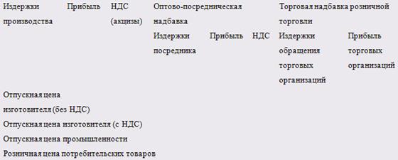 Рис. 1 Состав отпускной и розничной цены Выделяют следующие ценообразующие факторы: Затраты; Ценность товара; Спрос и его эластичность; Конкуренция; Государственное влияние. Существует два основных подхода к ценообразованию: затратный и ценностный. Затратный подход объединяет группу методов ценообразования, принимающих в качестве отправной точки фактические затраты фирмы на производство и организацию сбыта товара. В рамках затратного подхода выделяют определённые методы расчёта цен, а сами цены, определённые таким образом, получили название - "цены с ориентацией на издержки". В этой группе методов расчёта цен выделяют: Прайсинговые методы - в основе лежит принцип "издержки плюс прибыль". В качестве издержек могут использоваться полные, усреднённые, предельные, стандартные или нормативные затраты (полные, усреднённые, предельные затраты связаны с реальным производством; стандартные и нормативные оторваны от производства фирмы, они приняты при нормальных условиях производства - используются, когда нужно ограничить издержки). В качестве прибыли чаще всего берут среднеотраслевую, если иное не определено законодательством (идёт "накидка" на издержки) - есть товары, на которые "накидка" регулируется. Но существуют и другие методы определения прибыли — например, целевая прибыль. Если какое-то предприятие в силу определённой ситуации на рынке может воздействовать на цену (убедить или заставить рынок), то тогда оно может задавать прибыль (по модели "точки безубыточности"). Методы поэлементного расчёта цен. Когда используются эти методы, делается расчёт основных категорий затрат (например, прямые расходы на материалы, на заработную плату), а все другие категории затрат рассчитываются в процентах от основных показателей (выбирается показатель самый надёжный или более жёстко связанный с объёмом производства). Методы, основанные на установлении фиксированной цены. Эти методы используют, когда существуют стандартные цены (например, в случае стандартной продукции - массового, поточного производства). Работа с фиксированными ценами предусматривает возможность их изменения. Существуют различные методы, наиболее распространённый - корректировка по скользящей шкале. Основой для шкалы может быть, например, изменение стоимости валюты или наступление определённого события (например, инфляция). Особенность метода заключается в том, что порядок пересчёта должен быть отражён в договоре. Ценностное ценообразование - установление цен таким образом, чтобы это обеспечивало фирме получение большей прибыли за счёт достижения выгодного для неё соотношения "ценность товара / затраты на товар". В рамках ценностного ценообразования формируются цены с ориентацией на спрос. Наиболее известный метод - метод установления цены на основе ощущаемой ценности товара. Один из методов реализации этого метода ценообразования - это магазины без цен (например, антикварные магазины, скопление магазинов для туристов). На практике сложность этого метода упирается в уровень квалификации продавцов. Процесс торга - основной процесс при данном методе. Кроме двух описанных подходов выделяют метод "пассивного ценообразования". Какой бы подход предприниматели не выбирали, все равно придётся учитывать конкуренцию. Но анализ цен конкурентов может стать самостоят