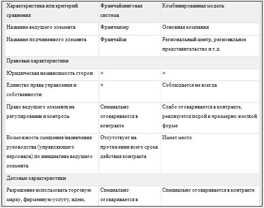 Такое сочетание принципов обоих механизмов хозяйствования позволяет сделать вывод о том, что перед нами комбинированная модель партнерства. Далее естественно возникает вопрос о причинах реализации в России именно такого варианта делового взаимодействия, а также о возможных перспективах данной модели, сочетающей в себе элементы как франчайзинга, так и представительства. Является ли этот вариант партнерства сегодня наилучшим, или же он представляет собой лишь промежуточную модель в процессе поиска новых форм развития бизнеса? Для того чтобы ответить на этот вопрос, сначала проведем сравнительный анализ франчайзинга и новой, комбинированной модели. Будем использовать те же критерии, которые были выделены для проведения сравнительной характеристики франчайзинговой системы и сети представительств. Результаты сравнительного анализа представлены в таблице: