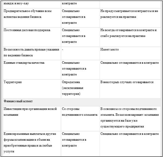 Наконец, в-четвертых, отметим различные принципы инвестирования при организации новой компании. Большая часть финансовых вложений осуществляется со стороны подчиненного элемента в системе франчайзинга, а при организации представительств — со стороны ведущего элемента. Как уже было отмечено, в этом и заключается основное преимущество франчайзинга для крупной компании.