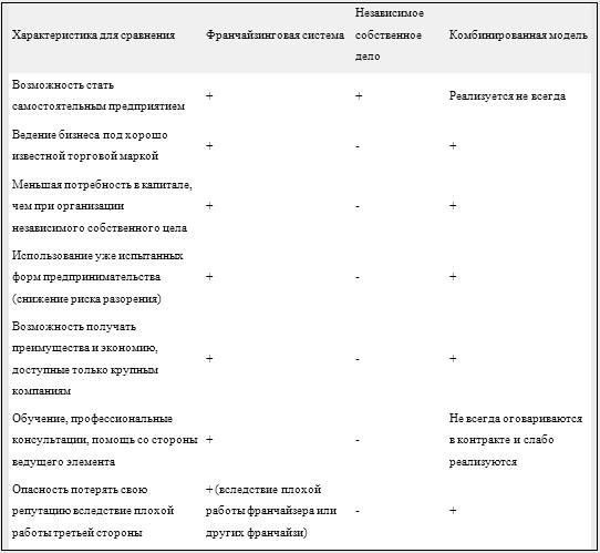 Существуют по крайней мере два способа стать самостоятельным предпринимателем: либо организовать независимое собственное дело, либо использовать потенциал сотрудничества с известной торговой маркой. При этом, как уже было отмечено, возможно несколько путей реализации второго направления: в качестве альтернативы классической франчайзинговой модели в России выдвигается комбинированный вариант сотрудничества. Аналогично описанной выше ситуации с целью выявления преимуществ и недостатков франчайзинговой системы, независимого собственного дела и комбинированной модели с точки зрения потенциального предпринимателя проведен сравнительный анализ всех трех моделей. Результаты анализа представлены в таблице: