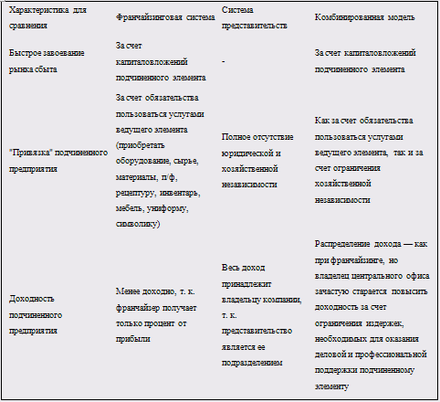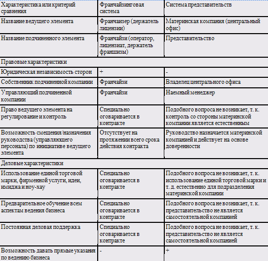 Результаты сравнительного анализа франчайзинговой системы и представительств представлены в таблице: