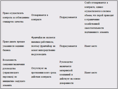 · право веющего элемента на регулирование и контроль слабо оговаривается в контракте, реализуется порой в чрезмерно жесткой форме;