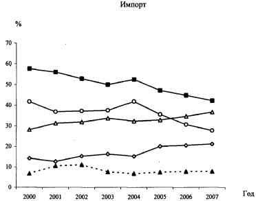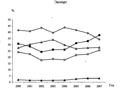 Рис. 1. Внешняя торговля Украины с наиболее приоритетными странами (удельный вес в общем объеме, %): - д-ЕС(25); - - страны СНГ; - о-Российская Федерация;-а- Беларусь; —▲— Туркменистан; - о- другие страны мира По официальным данным Минэкономики Украины, экспортно-импортные операции по продукции машиностроения характеризуются следующими показателями: удельный вес принципиально новой продукции, поставленной на экспорт в 1999-2006 гг., ежегодно существенно уменьшался, а удельный вес модернизованной и модифицированной продукции увеличивался. За этот же период более чем в 3 раза возрастал удельный вес экспорта новой продукции машиностроения, которая имела охранные документы, что свидетельствует о тенденции усиления внимания к защите прав на объекты украинской промышленной собственности. Поставки продукции машиностроения Украины на внутренний рынок уменьшились на 17, 3% в 2001 г., а затем стали расти в среднем на 20% в 2002-2006 гг. За этот период соотношение импорта с предложением товаров украинского машиностроения на внутренний рынок, которое можно охарактеризовать как показатель зависимости от внешних рынков, было довольно высоким (в среднем от 150 до 230%). В целом же товарная структура экспорта украинской товарной продукции на протяжении 2001-2006 гг. оставалась почти стабильной. Наибольший удельный вес в украинском товарном экспорте занимает продукция средних технологий низкого уровня (в среднем за шесть лет указанного периода - 55%), далее - низких технологий - 20%. Удельный вес средних технологий высокого уровня составляет 18, а высоких - около 5%. (рис. 2, [1]). Таким образом, проявляется известная тенденция преобладающей низкоукладности* украинского промышленного производства как результат отсутствия каких-либо изменений в структурной политике страны.