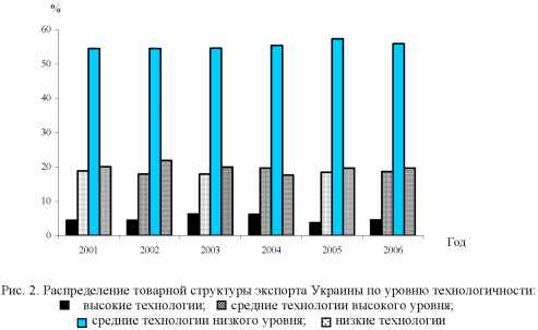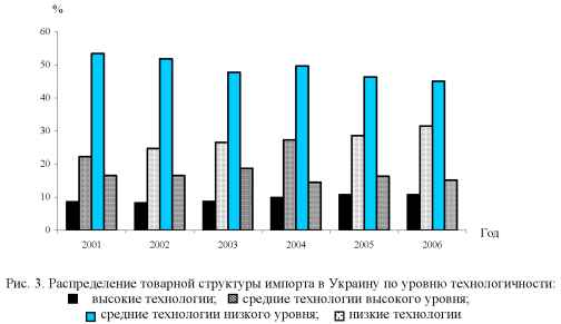В связи с вышеизложенным закономерно считать, что удельный вес импорта в Украину высокотехнологичной продукции увеличился (рис. 3, [1]). В целом, динамика данного процесса стабильна. Структура украинского экспорта свидетельствует о неэффективности использования научно-технологического потенциала. Например, если в 2002 г. доля металлургической продукции в мировом экспорте составила 2, 3%, а продукции машиностроения - 40, 5%, то в Украине соответственно 39, 7 и 13, 6%.