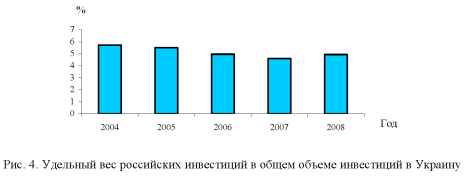 Украина на сегодня является ключевой страной в системе вложений капитала российским бизнесом как за счет своего значительного экономического потенциала, так и сложившегося разделения труда на постсоветском пространстве. Следует отметить, что на протяжении последних лет и общие объемы иностранного инвестирования в экономику Украины, и объемы инвестирования из России имеют положительную динамику (рис. 4). Так, удельный вес российских инвестиций в общем объеме иностранных инвестиций в 2004-2007 гг. имел тенденцию к падению (с 5, 74% на начало 2004 г. до 4, 62% на начало 2007 г.), а на протяжении 2007 г. он несколько увеличился (до 4, 94% на начало 2008 г.).