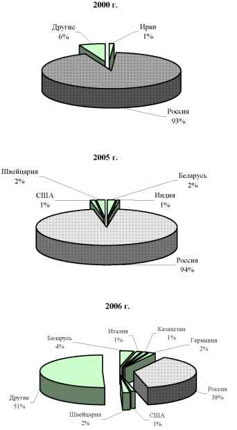 * Составлено по данным ВОИС. В 2006 г. список лидеров по подаче заявок на патентование не изменился. Республика Корея, где в 2006 г. наблюдался рост на 26, 6% по сравнению с 2005 г., обогнала Великобританию и Францию и стала 4-й страной по количеству поданных по процедуре РСТ, а Китай, где использование заявителями системы РСТ возросло на 56, 8%, обогнал Швейцарию и Швецию и занял 8-е место. В этой связи следует обратить внимание на состояние дел в сфере управления интеллектуальной собственностью в Украине. Структура подачи заявок на выдачу охранных документов в патентные ведомства других стран по годам показана на рис. 5-7 [10]. Как видно, во всех случаях Российская Федерация является основной страной, куда Украина направляет свои охранные документы для регистрации.