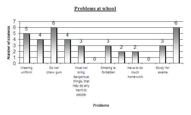 Топик: Problems At SchoolТопик: Problems At SchoolThe survey Carried out by: A. Luik D. Grunichev S. Golubev The survey was carried out on the 4th of December in Secondary School of Humanities; among 11 students of from 9C aged 14-16. A task, which our group asked the students to do, was about to choose the main problems at their school from out list. These problems were: Wearing uniform Go to school everyday Do not chew gum Do not listen to a player Do not chew gum Must not bring dangerous things, that may do any harm to people Do not listen to a player It is not allowed to make defiant hair Smoking is forbidden Running in a corridor or being in aggressive state is not allowed Have to do much homework Interrupt teacher's speech during the lesson is not allowed Study for exams Have to be at school before the beginning of the lesson at least in 5 minutes Finally the results are: the majority of students strongly disagreed with being strictly prohibited to chew gum at school. It is so, because, as they said, that you they can hardly lose their habits. The same amount of votes was given to the problem of being in the classroom in 5 minutes before the beginning of the lesson. There were many contradicting judgments on this topic, however the results were achieved in the long discussion. Five votes were given to the problem of wearing uniform, as the result of differing desires of students, talking about their wardrobe. They all want to wear clothes, which they want. In less interest were affected subjects of going to school everyday and of listening to a player during the lesson (4 votes). Concerning the first – there was a very simple answer that anyone can guess. Listening to music, though it amuses you, makes the information coming from the teacher either not to come to your ears, or “rush” them by. Pupils are very excited with terrorism at school and they as hate smoking, as do so with studying for exams. This question came with 3 points from each person. It is very surprising, after all precedent questions, that our pupils like to do homework, and no wonder, that are running in the corridor from on side to other in a very aggressive state. Negative attitude pupils were giving the answer on the problematic questions about teacher’s interrupt and “punk” hair – 0 of them had ticked this point. In conclusion I would like to explain the obtaining outcomes. From the viewpoint of the students they are so because for many of them studying at school “looks like”, as living at home, for the reason that they stay there great part of the time. Then they want to do the same things that they do at home. Maybe many people will not agree with this young generation, but life is still going on, and you might live in such a way, as you like.