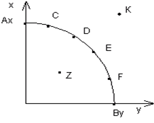 Рис. 1. Кривая производственных возможностей Каждая точка кривой Аx Вy показывает, какой набор товаров X и Y может произвести общество, используя в полном объеме имеющиеся ограниченные производственные ресурсы. Представим, что ограниченный набор ресурсов используется обществом для производства только двух товаров Х и Y. Можно так распорядиться ресурсами, что все они будут направлены на выпуск товара Х. В этом случае будет изготовлено Ах единиц товара Х и ни одной единицы товара Y. В другом крайнем варианте, все производственные факторы направлены на выпуск товара Y, и в результате изготавливается Ву единиц товара Y, и ни одной — товара Х. Во всех остальных случаях, чтобы произвести одновременно и товары Х, и товары Y необходимо сделать выбор: сколько единиц товара Х изготовить за счет отказа от выпуска какого-то количества товара Y. Каждая точка кривой АхВу показывает возможные соотношения выпуска товаров Х и Y при полном использовании всех имеющихся ресурсов. В этой связи линия АхВу называется кривой производственных возможностей. В силу ограниченности ресурсов, выпуск любых соотношений товаров Х и Y, соответствующих точкам вне области 0АхВу (например, точке К), недостижим. Наоборот, любая комбинация товаров Х и Y, соответствующая точкам внутри области 0АхВу (точка Z), может быть произведена даже с помощью части используемых ресурсов. 1. Ограниченности ресурсов. Об этом свидетельствует область недостижимых комбинаций товаров Х и Y за линией РРС (как, например в точке К). 2. Необходимости выбора. Надо решить: какой набор товаров Х и Y, соответствующий линии РРС, удовлетворит запросы общества. 3. Существования издержек упущенной возможности. На это показывает падающий характер кривой РРС, так как для производства дополнительной единицы товара Y надо отказаться от выпуска какого-то количества товара Х, т.е. нести издержки упущенной возможности. 4. Увеличения издержек упущенной возможности. Выпуск первых единиц товара Y, можно осуществить, используя наиболее производительные ресурсы. Это поначалу не вызовет резкого уменьшения производства товара Х. Однако, по мере дальнейшего расширения объемов выпуска товара Y, необходимо привлекать менее качественные ресурсы. В этой связи каждая дополнительная единица Y потребует отказа от производства все увеличивающегося количества товара Х. Следовательно, с ростом выпуска товара Y, издержки упущенной возможности постоянно увеличиваются. По этой причине кривая РРС является выпуклой (или вогнутой по отношению к началу координат). Рост издержек упущенной возможности при расширении производства любого товара носит фундаментальный характер, вследствие чего это явление трактуется как закон увеличивающихся издержек. 2.3 Специализация и разделение труда К факторам производства, как известно, наряду с землей, капиталом, предпринимательскими способностями и информацией относится труд. Труд выступает как трудовые услуги всех работающих, т.е. услуги неквалифицированных и квалифицированных рабочих, предпринимателей, управляющих и руководителей фирм. Важнейшим инструментом рынка труда является биржа, где непосредственно формируются спрос на рабочую силу различного вида и ее предложение. Биржа труда учитывает весь резерв рабочей силы, занимается подготовкой и переподготовкой безработных, организац