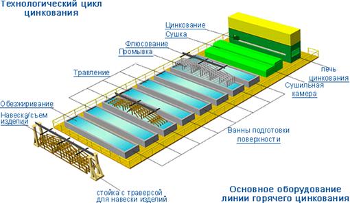 Рисунок 3. Схема линии горячего цинкования Навеска продукции осуществляется вручную, как правило, путем подвески и увязки металлоконструкций на траверсы проволокой диаметром 3–6 мм (в зависимости от массы изделий). При оцинковании мелких изделий для повышения производительности навески могут применяться специальные приспособления. Размер изделий, их конструктивные особенности важны для рационального выбора способа навески и количества навешиваемых изделий, т. о. для различных конфигураций цинкуемых изделий требуются особые, индивидуальные способы навески. На качество и толщину цинкового покрытия оказывает влияние угол наклона изделия к поверхности расплава цинка в ванне цинкования (чем больше угол наклона, тем меньше толщина и лучше качество поверхности покрытия). Угол навески цинкуемых изделий ограничен габаритными размерами ванн подготовки и ванны цинкования. Для стального проката этот угол составляет 10–45 градусов. Последним этапом технологического цикла оцинкования изделий является съем оцинкованной продукции с траверс для отгрузки. Для сохранения качества цинкового покрытия при съеме изделий необходимо соблюдать ряд требований: изделия должны быть охлаждены; должны быть исключены контакты, а также удары и падения между собой и пр. металлическими предметами; отгрузка и увязка оцинкованных изделий должна осуществляется тканевыми тросами. Обезжиривание. Поверхность стали подлежащая цинкованию, всегда, за исключением редких случаев, в большей или меньшей степени загрязнена маслами или жирами. Эти компоненты появляются на металлоконструкциях вследствие предшествующих обработок и / или манипуляций, которым они подвергались. Это особенно касается деталей, изготовленных из листа. Жиры и масла, подвергаясь старению при контакте с атмосферой, модифицируются, что порой еще больше затрудняет их удаление. Жировое покрытие действует как непроницаемая оболочка на оксидах, из-за чего не происходит полного процесса кислотного травления. Часто жировые вещества проникают вглубь пор на поверхности и не обнаруживаются при поверхностном визуальном обследовании. Обезжиривание поверхности металлоконструкций имеет все основания рассматриваться в качестве основной процедуры всего цикла химической подготовки к процессу горячего цинкования. Эффективное обезжиривание дает гарантию выполнения успешного качественного процесса травления. Травление. Металлы имеют свойство окисляться, т. о. сталь всегда покрыта слоями оксидов, состоящих из химических соединений железа с кислородом и водой, состав и толщина которых зависят от условий, при которых они формировались. Оксидный слой препятствует реакции жидкого цинка с железом и потому должен быть устранен до металлургического процесса цинкования. Если и существуют ситуации, при которых очистка проводится механически (пескоструйная очистка), в огромном большинстве случаев металлоконструкции проходят химическую обработку процедурой кислотного травления. Кислоты, используемые при горячем оцинковании, следующие: соляная кислота и серная кислота. Из двух кислот, в технологии цинкования предпочтительней первая, поскольку она активна при температуре окружающей среды, и создаёт меньше проблем на следующей стадии химической обработки. Промывка. Операция промывки необ