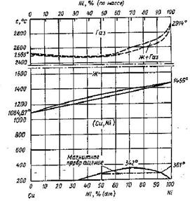 Обе фазы имеют одинаковую структуру (ГЦК). Это можно объяснить высоким сродством меди и никеля. На диаграмме состояния (рис. 1.1.) видно, что сплав плавится конгруэнтно во всём диапазоне концентраций. Более того, линии ликвидуса и солидуса расположены очень близко друг к другу, то есть плавление происходит почти в изотермических условиях, как у чистого металла. Аналогично происходит и испарение сплава. На основании этого можно записать, что: