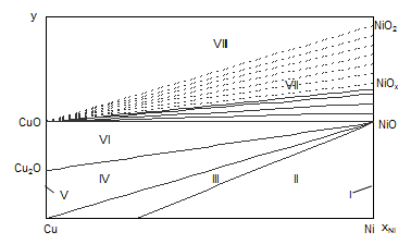 На диаграмме 2.1. можно выделить 8 областей, в которых присутствуют следующие фазы: I – γ-фаза + NiO, II – α-фаза + γ-фаза + NiO, III – α-фаза + NiO, IV – α-фаза + NiO + Cu2O, V – α-фаза + Cu2O, VI – Cu2O + CuO + NiO, VII – CuO + NiOx (1<x<2), VIII – CuO + NiO2 + {O2}. Области I и V очень малы и в масштабе диаграммы вырождаются в линии. Анализируя диаграмму Cu – Ni – O можно сделать следующие выводы о химической устойчивости медно-никелевых сплавов: 1) Окисление