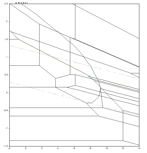 На диаграмме можно выделить 46 областей преобладания различных фаз: I. α (мельхиор МНЖМц30–1–1), II. α + Mn2+, III. α + MnO, IV.α + Mn2+, Fe2+, V. α + [(Fe1-xNix) Fe2O4] + Mn2+, VI.α + [(Fe1-xNix) Fe2O4] + MnO, VII. α + Mn2+, Ni2+, Fe2+, VIII. α + CuFeO2 + Ni2+, Mn2+, IX.α + CuFeO2 + [(Fe1-xNix) Fe2O4] + Ni2+, Mn2+, X. α + CuFeO2 + [(Fe1-xNix) Fe2O4] + NiOx + Mn2+, XI.α + CuFeO2 + [(Fe1-xNix) Fe2O4] + NiOx + MnO, XII. α + CuFeO2 + [(Fe1-x-yNixMny) (Fe2-zMnzO4)] + NiOx, XIII. Cu2+, Mn2+, Fe2+, Ni2+, XIV. CuFeO2 + Mn2+, Ni2+, XV. Cu2O + CuFeO2 + Mn2+, Ni2+, XVI. CuO + CuFeO2 + Mn2+, Ni2+, XVII. Cu2O + CuFeO2 + [(Fe1-xNix) Fe2O4] + Mn2+, Ni2+, XVIII. Cu2O + CuFeO2 + [(Fe1-xNix) Fe2O4] + NiOx + Mn2+, XIX. Cu2O + CuFeO2 + [(Fe1-x-yNixMny) (Fe2-zMnzO4)] + NiOx, XX. CuO + CuFeO2 + [(Fe1-xNix) Fe2O4] + Mn2+, Ni2+, XXI. CuO + CuFeO2 + [(Fe1-xNix) Fe2O4] + NiOx + Mn2+, XXII. CuO + CuFeO2 + [(Fe1-x-yNixMny) (Fe2-zMnzO4)] + NiOx, XXIII. CuO + CuFeO2 + Mn3O4 + Ni2+, XXIV. CuO + CuFeO2 + NiOx + Mn2+, XXV. CuO + CuFeO2 + NiOx + Mn3O4, XXVI. CuO + CuFeO2 + Mn2O3 + Ni2+, XXVII. CuO + CuFeO2 + NiOx + Mn2O3, XXVIII. CuFe2O4 + Mn2O3 + Ni2+, XXIX. CuFe2O4 + Mn2O3 + NiOx, XXX. Cu2+, Mn2+, Fe3+, Ni2+, XXXI. Fe2O3 + Cu2+, Mn2+, Ni2+, XXXII. CuFe2O4 + Ni2+, Mn2+, XXXIII. CuFe2O4 + MnO2 + Ni2+, XXXIV. CuFe2O4 + NiOx + MnO2, XXXV. MnO2 + Cu2+, Ni2+, Fe3+, XXXVI. MnO2 + Fe2O3 + Cu2+, Ni2+, XXXVII.